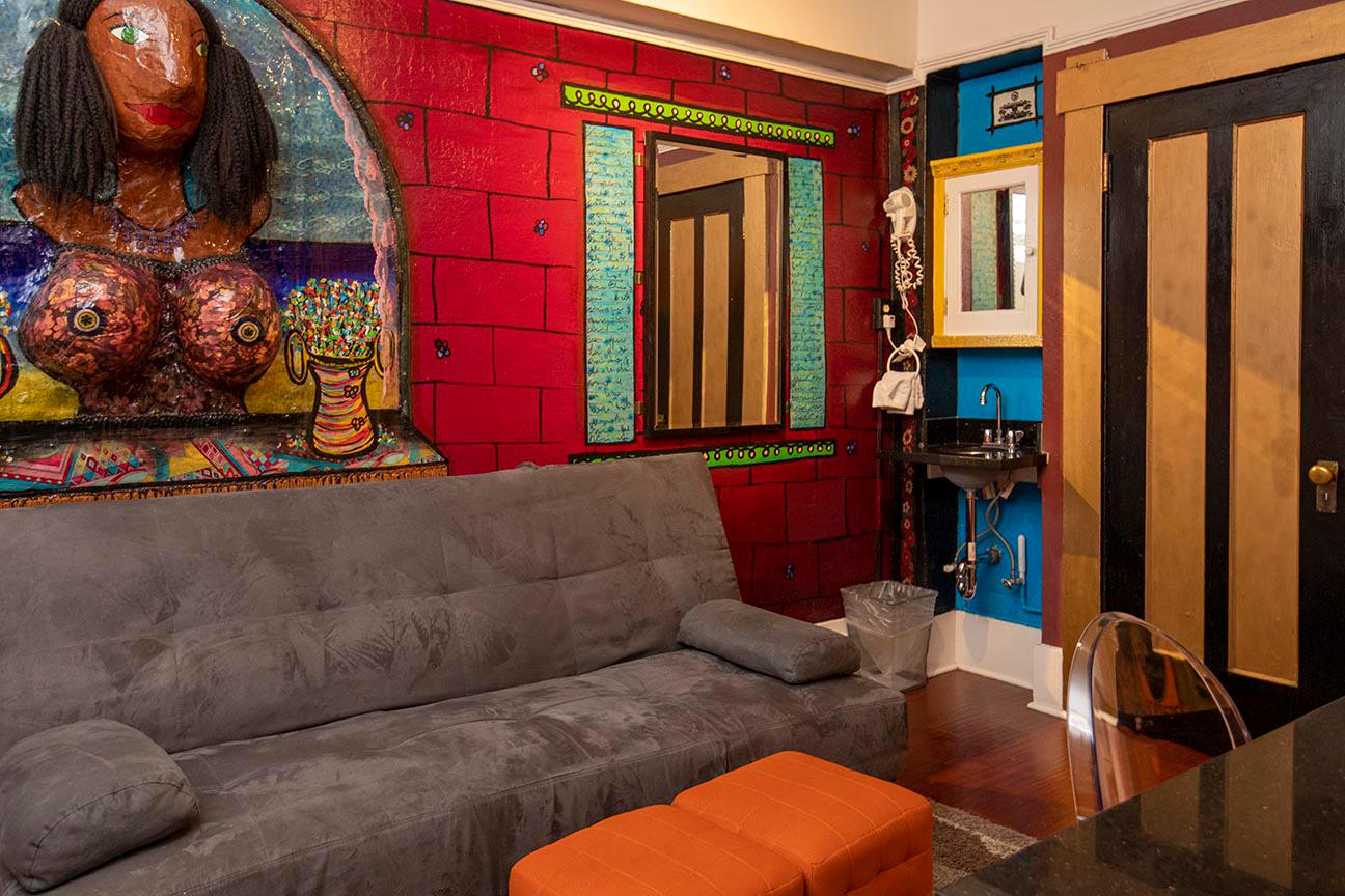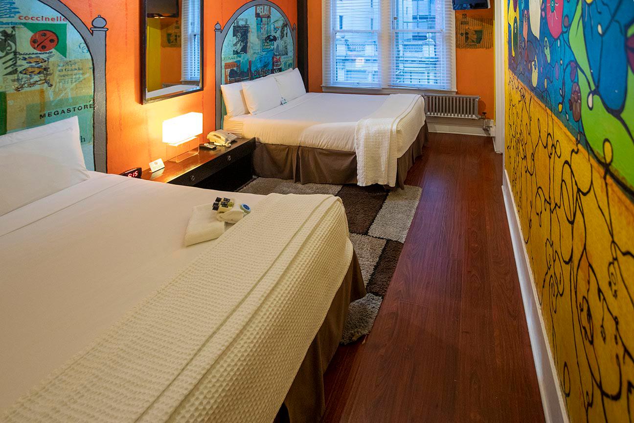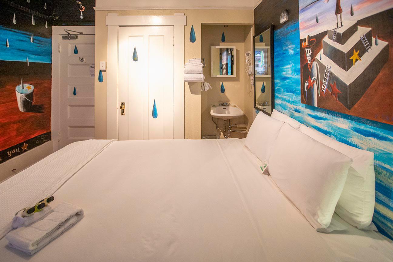 Our Standard Queen Rooms provide a comfortable queen-sized bed and a private in-room bathroom for your convenience. Each room includes a small desk, a flat Smart TV, a refrigerator, and is adorned with distinctive artwork, adding to the hotel's creative atmosphere. Facilities Desk, Refrigerator, Free WiFi Internet, Hairdryer, Non-smoking, Hypoallergenic bedding, Pay per view movies, Heating, Clothes rack, Limited accessibility, TV / movie streaming service, Additional blankets, Linen provided, Smartlock access, Smoke detector, High Definition (HD) Flat Panel Television, Upper floor accessible by elevator