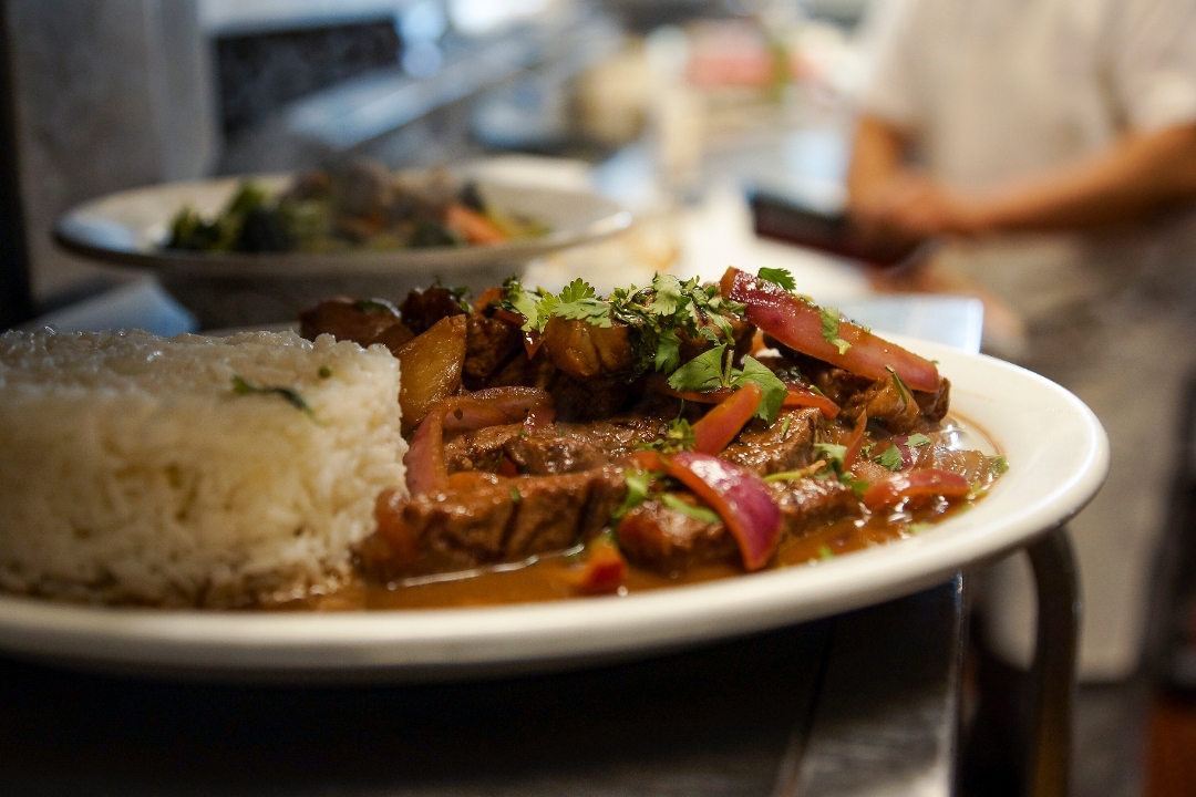 Your choice of thinly sliced top sirloin or tender chicken sautéed with red onions, tomatoes, red potatoes, balsamic vinegar, soy sauce, garlic, cilantro, salt and pepper. Served with white rice and sautéed spinach.