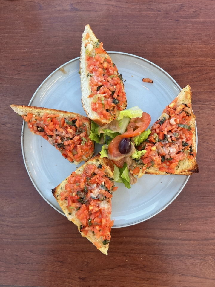Baked bread, butter, tomatoes, cut garlic, green onions, basil, and Parmesan cheese