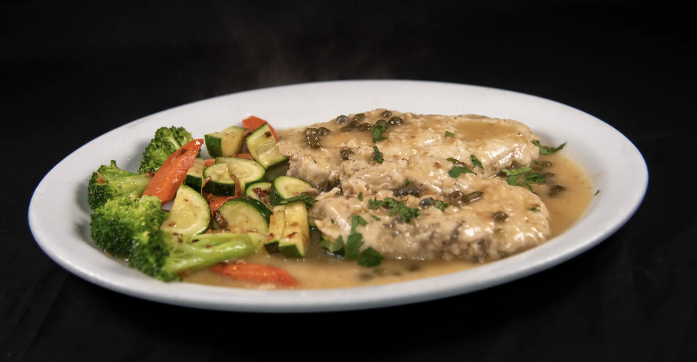 Tender chicken breast sautéed with capers in a lemon sauce. Served with either spaghetti, vegetables (broccoli, zucchini, and carrots), or half spaghetti & half vegetables