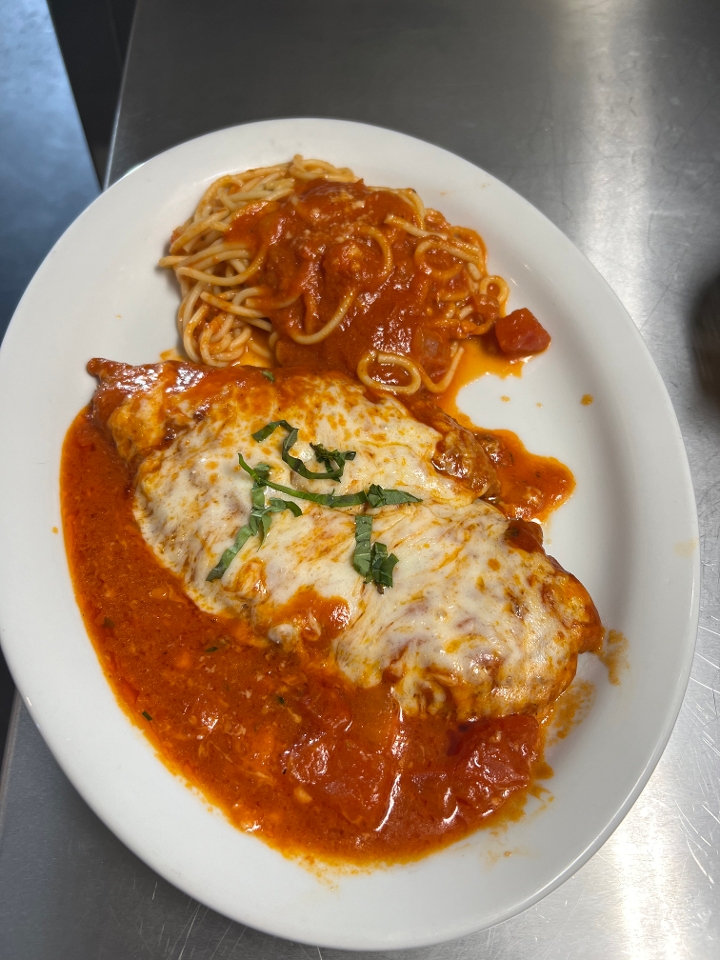 Tender chicken breast baked with mozzarella cheese and tomato sauce topped with Parmesan cheese. Served with either spaghetti, vegetables (broccoli, zucchini, and carrots), or half spaghetti & half vegetables