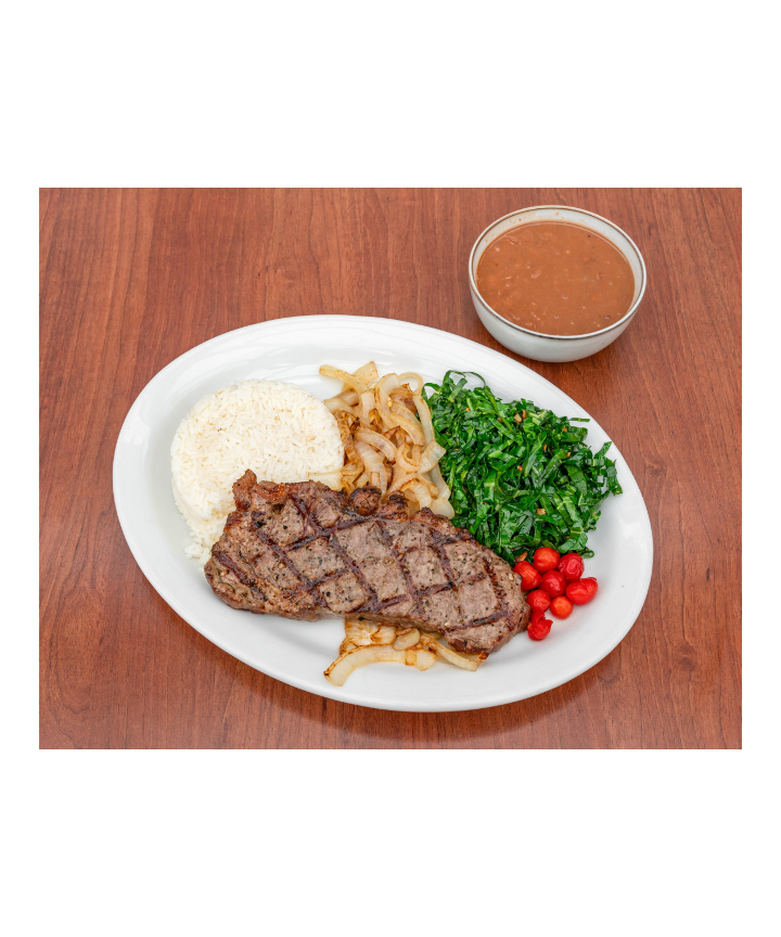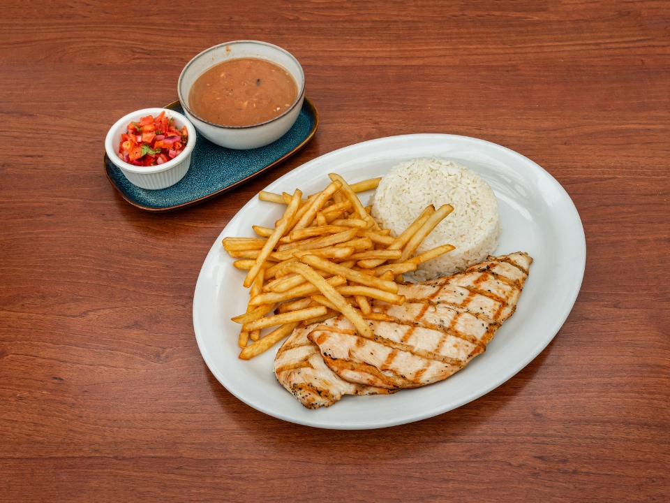 Grilled beef or chicken, served with rice, red beans, french fries, and onion tomato salad
