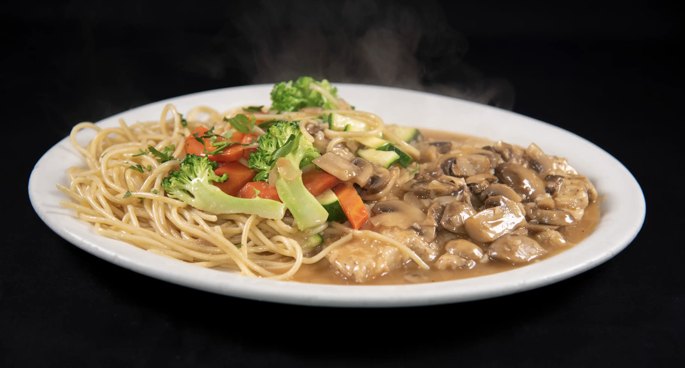 Tender chicken breast sautéed in Marsala wine and mushrooms. Served with either spaghetti, vegetables (broccoli, zucchini, and carrots), or half spaghetti & half vegetables