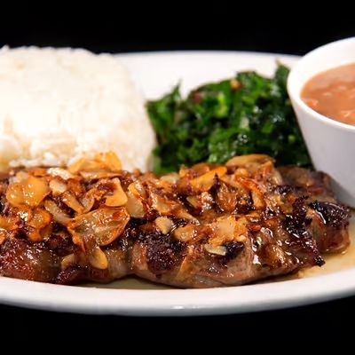 Grilled New York Steak (8 oz) with onions, served with rice, red beans, and collard greens