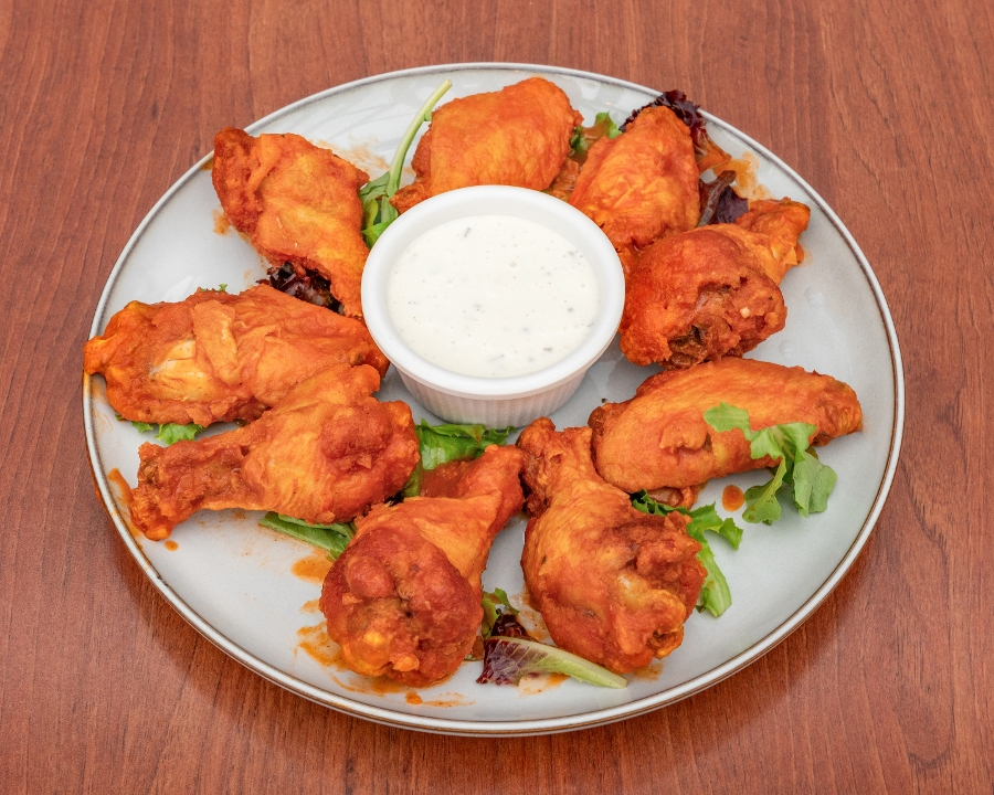 Oven-baked homemade jumbo chicken wings tossed with original Frank's hot sauce or BBQ sauce. 8 wings an order, served with ranch or bleu cheese dressing