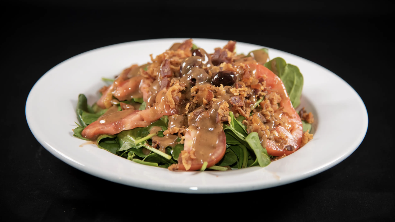 Lots of spinach topped with crispy bacon, tomatoes, and kalamata olives. Served with vinaigrette dressing