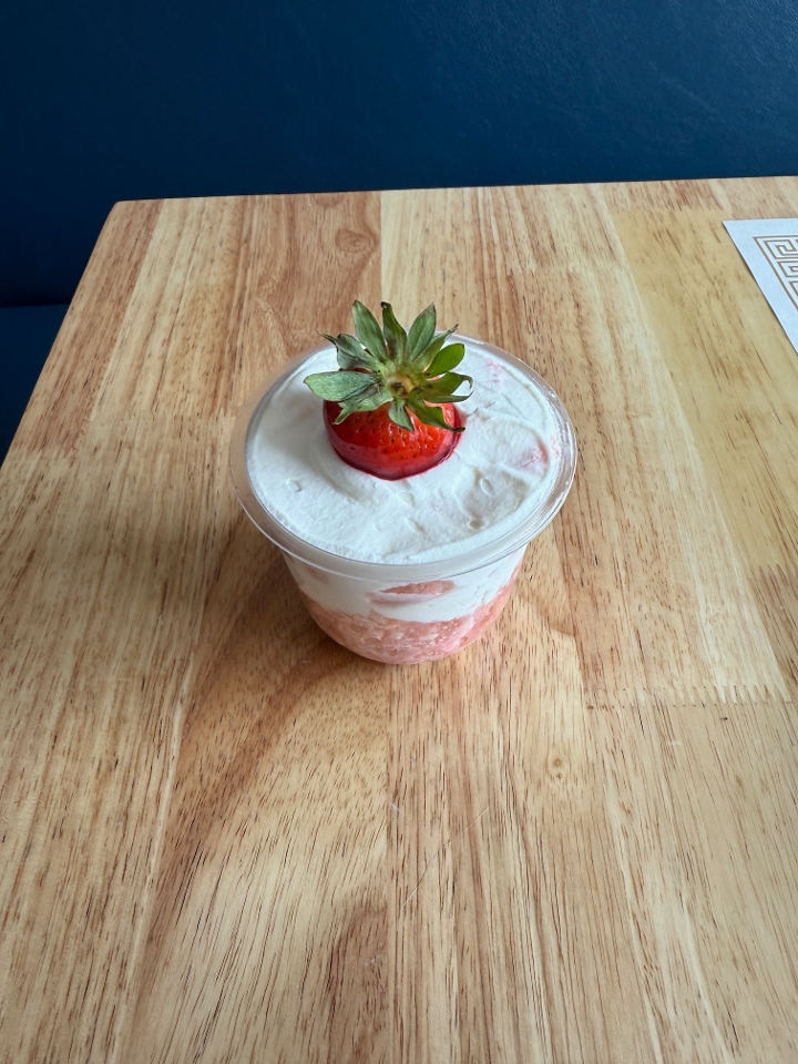 Strawberry cake covered with tres leches mix and strawberries on top.