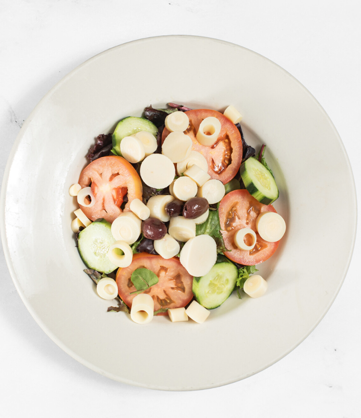 Hearts of palm, organic spring mix, tomatoes, cucumber, and kalamata olives. Served with creamy Italian dressing