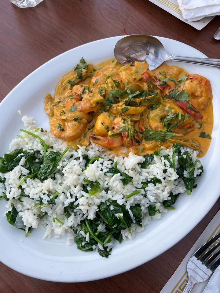 Prawns sautéed with coconut milk, cilantro, red palm oil, green and red peppers, onions, and tomatoes. Served with spinach and rice