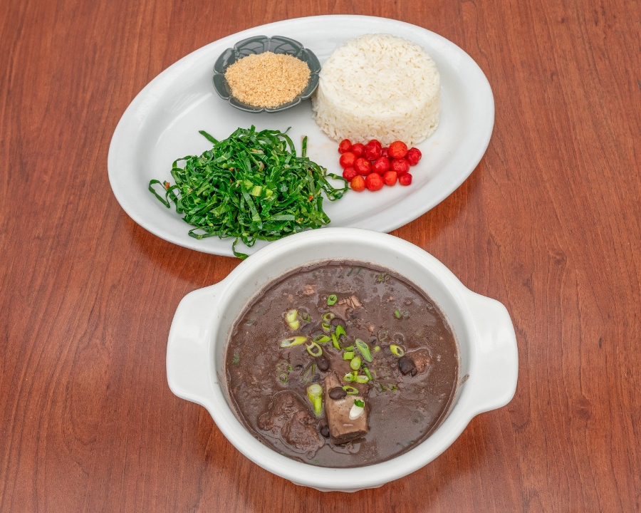 Black bean stew with fresh and smoked meats (pork and beef, served with collard greens, rice, and farofa (toasted yucca flour)