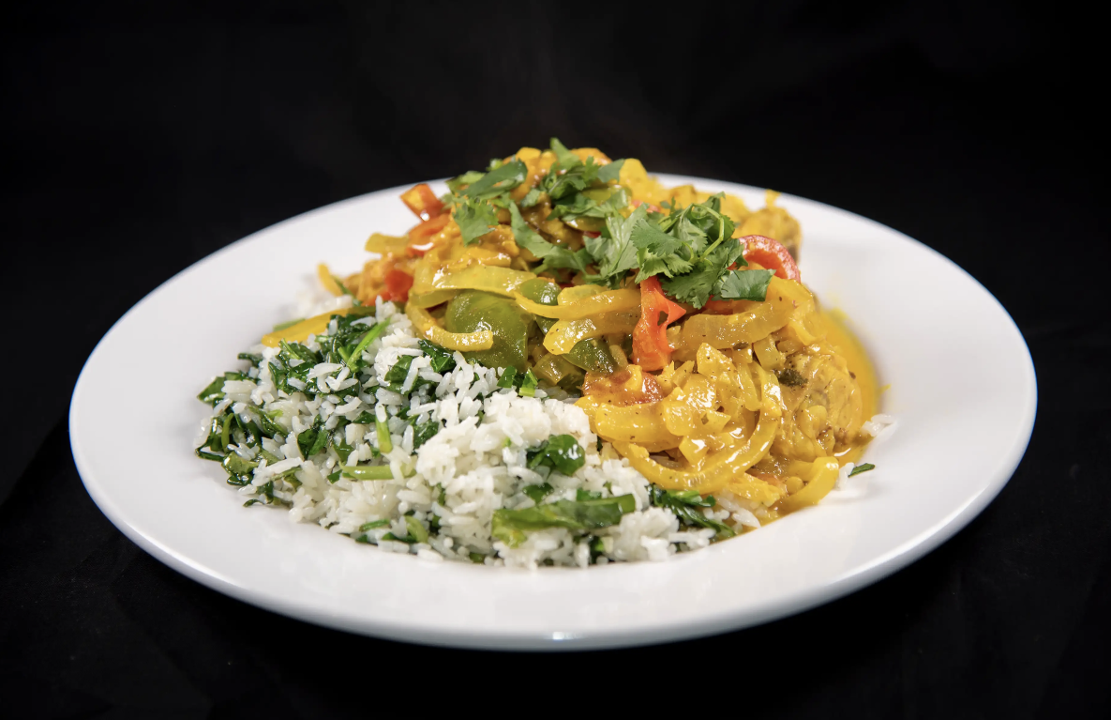 Simmered fish of the day with bell peppers, onions, cilantro, and coconut milk in a light tomato sauce with slices of hard boiled eggs. Served with spinach and rice