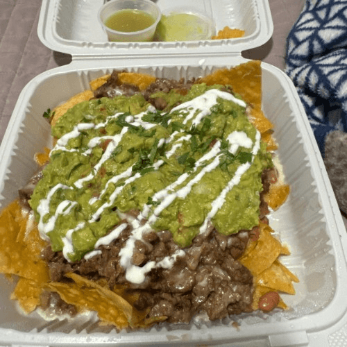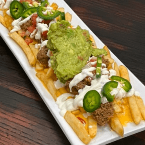 Choice of meat, rice, beans, cheese, pico de gallo or onions and cilantro depending on choice of meat. Served with sour cream and guacamole