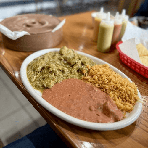 Chile Verde, Rice, Beans, Potatoes, Sour Cream, Onions and Cilantro