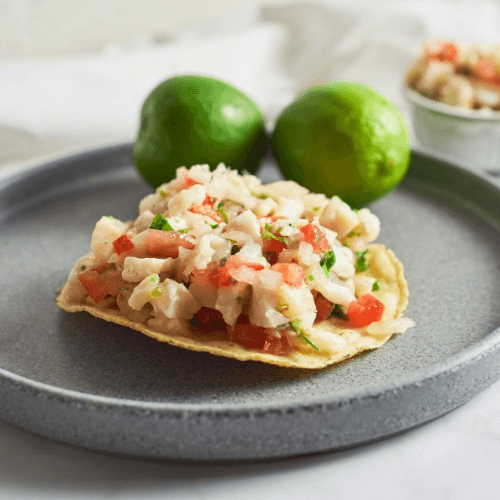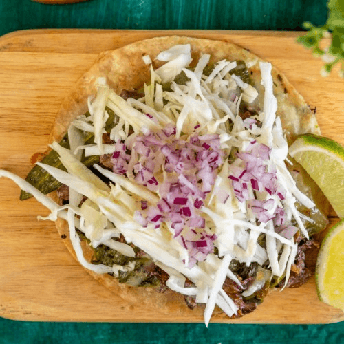 Tostada, cheese, meat, cilantro, onions, guacamole