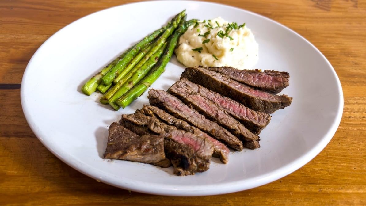 Grilled marinated skirt steak with guajillo pepper sauce. Served with grilled asparagus and garlic mashed potatoes