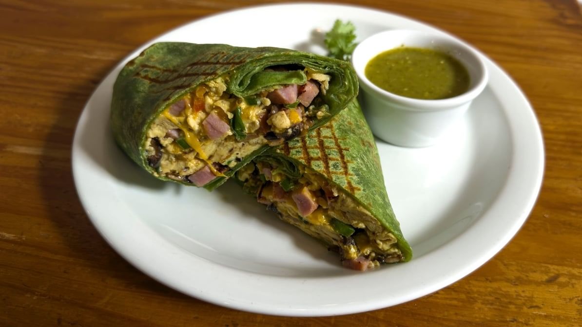 Ham, roasted red potatoes, cheddar cheese, mushrooms, bell peppers, scallions. Choice of spinach or flour tortilla