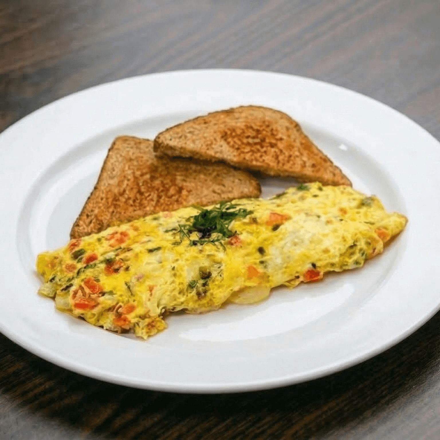 2 eggs of any style, bacon, homemade roasted potatoes, and sliced bread