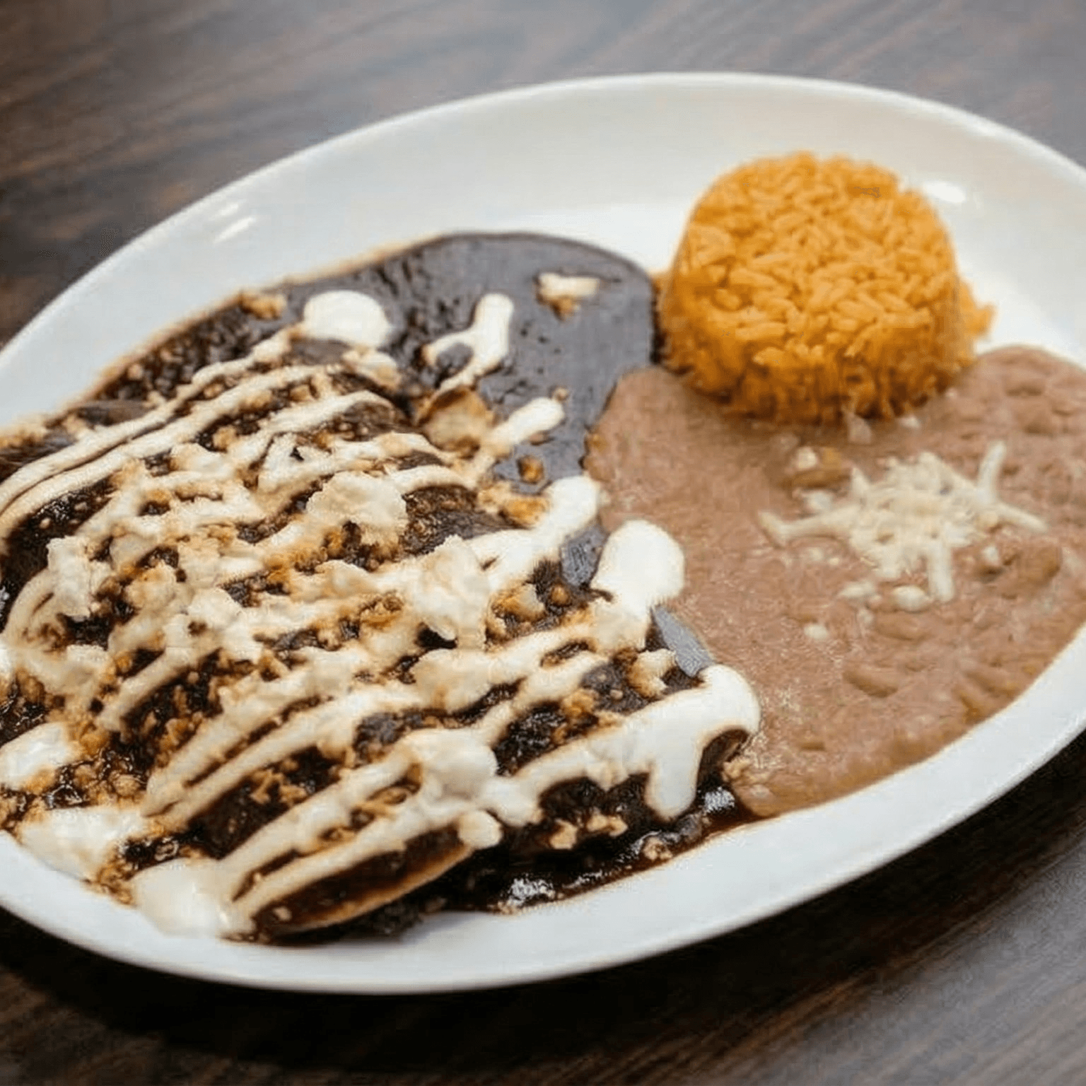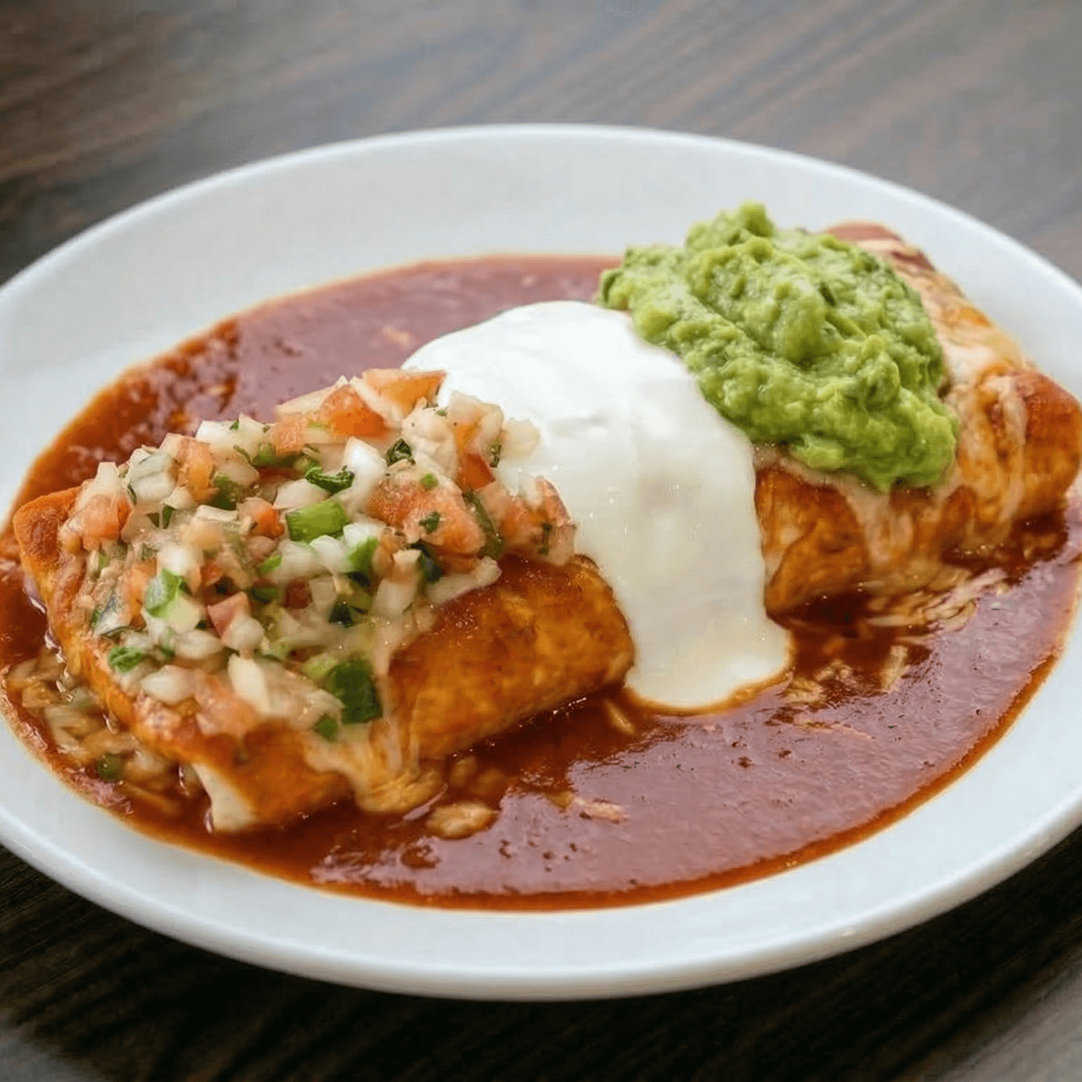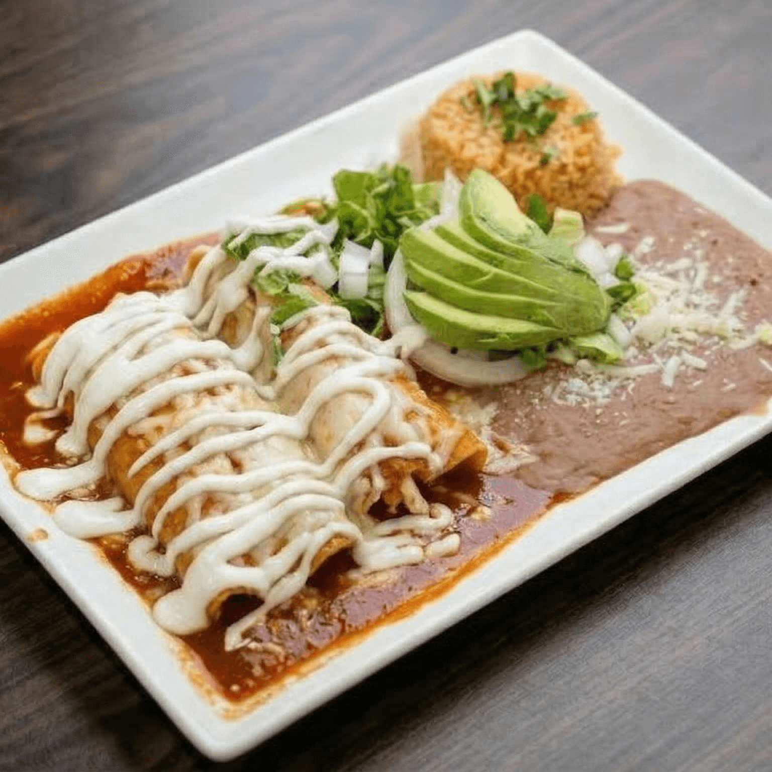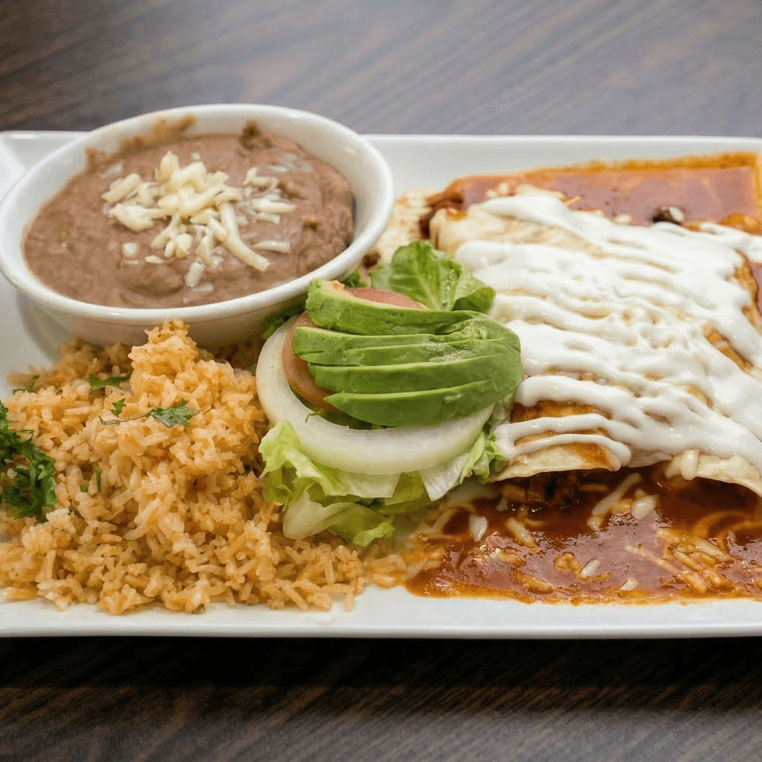 Choices of sauce, red or green, and meat (carne asada, chicken, al pastor, carnitas, chile verde, shrimp, fish). Served with cheese, rice, refried beans, and side salad.