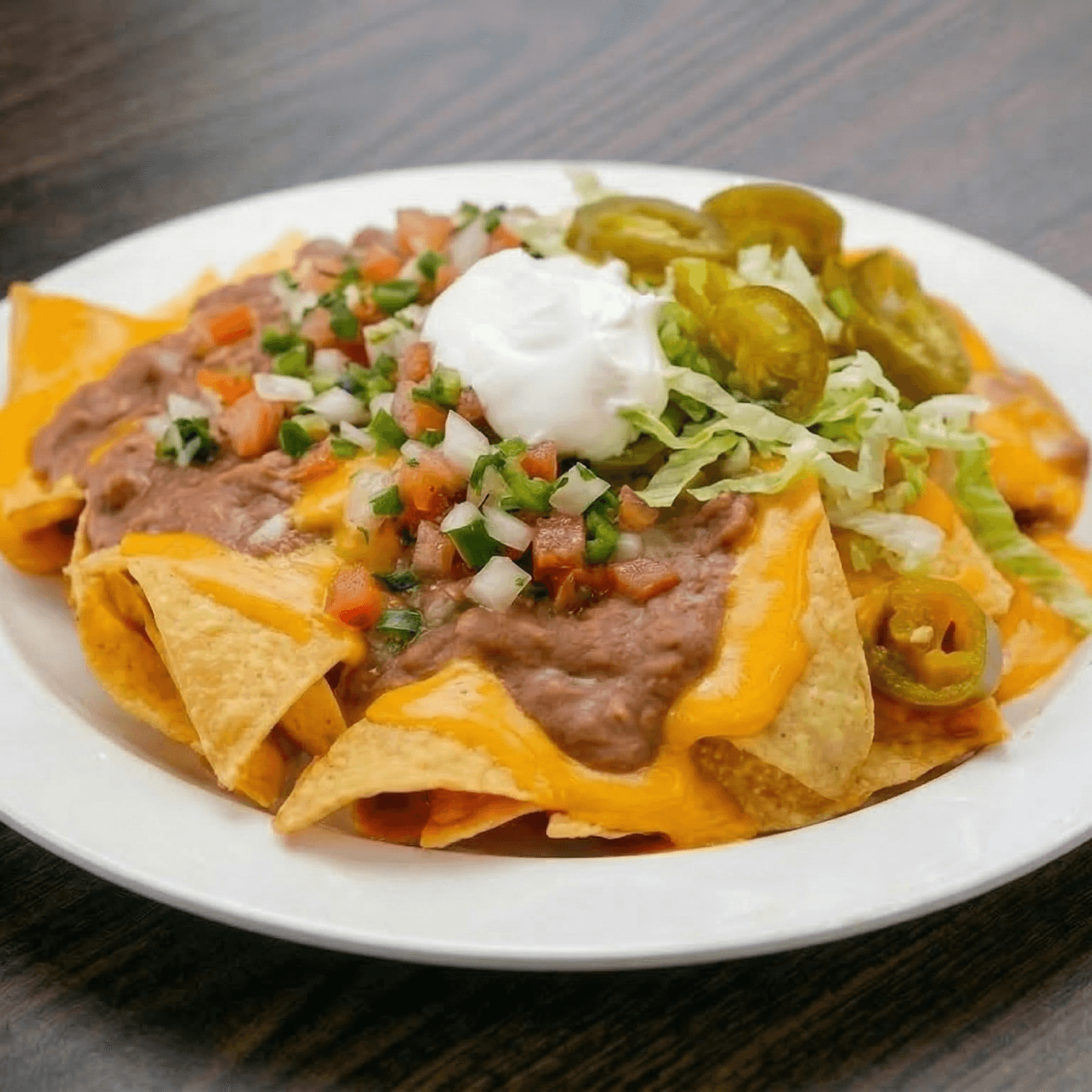 Refried beans, cheese, pico de gallo, jalapeños, sour cream, and lettuce.