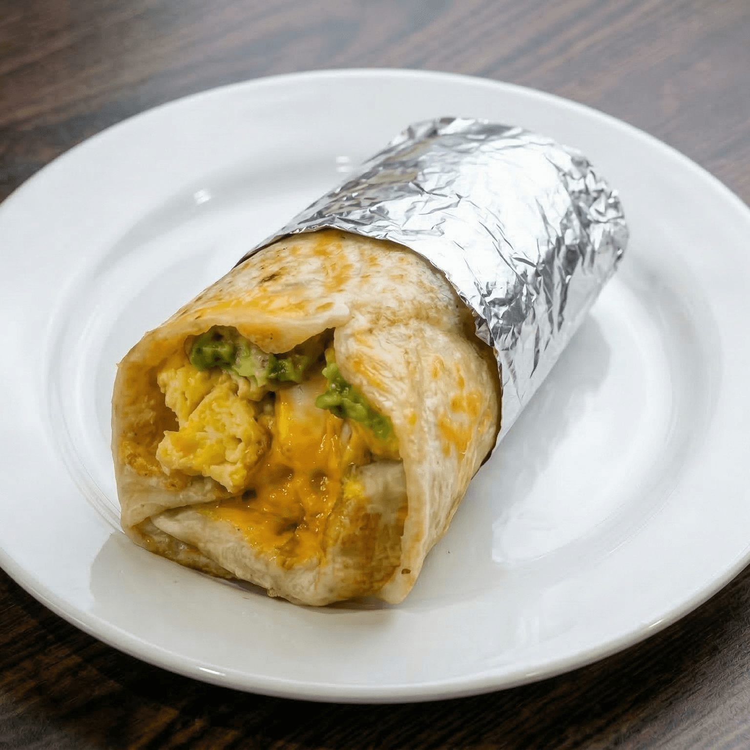 Scrambled, eggs, diced tomatoes, onions, jalapeños, cheddar cheese, and avocado.