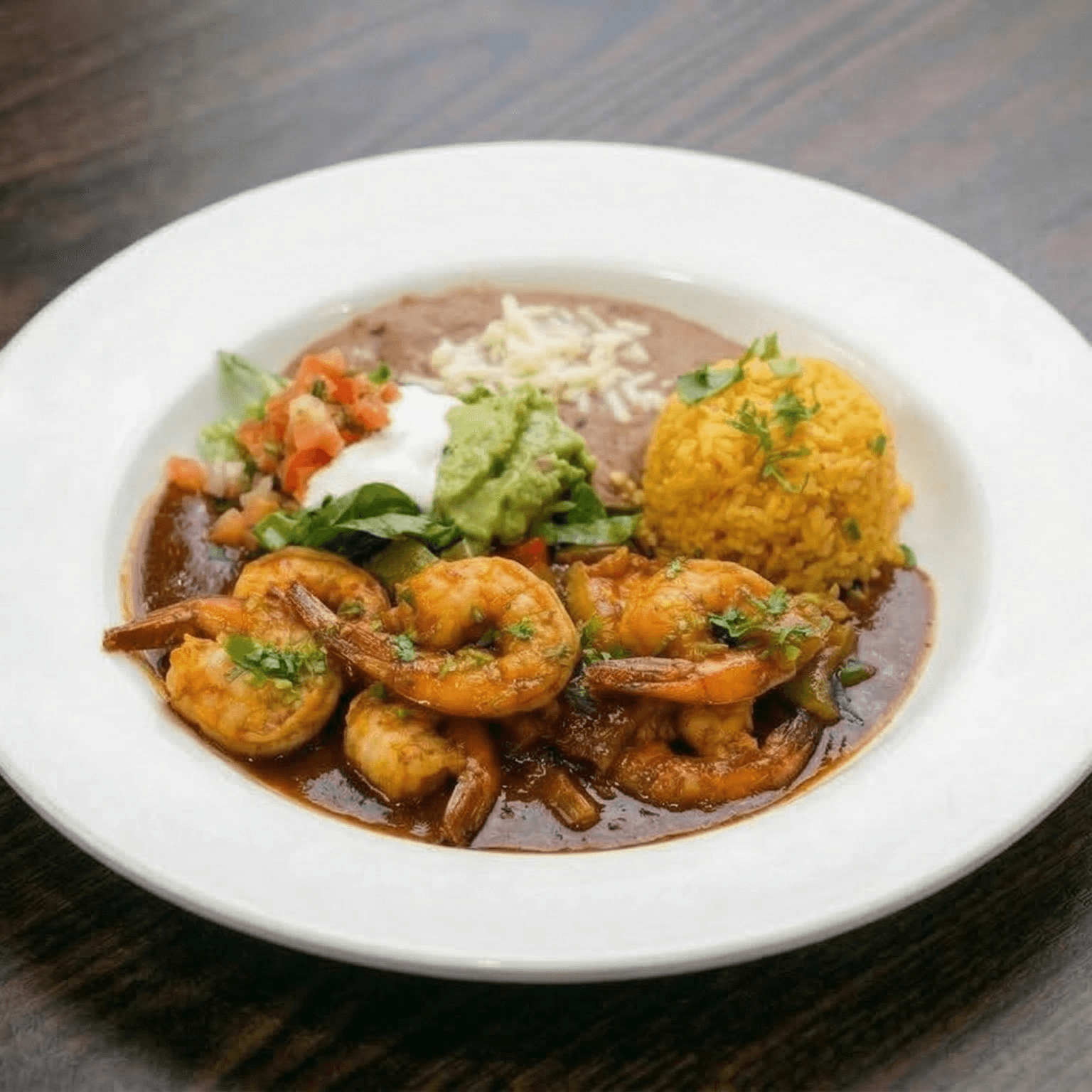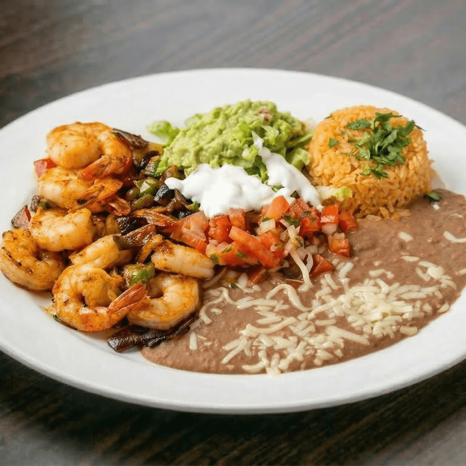 Shrimp, beef and chicken, rice, and refried beans side salad.