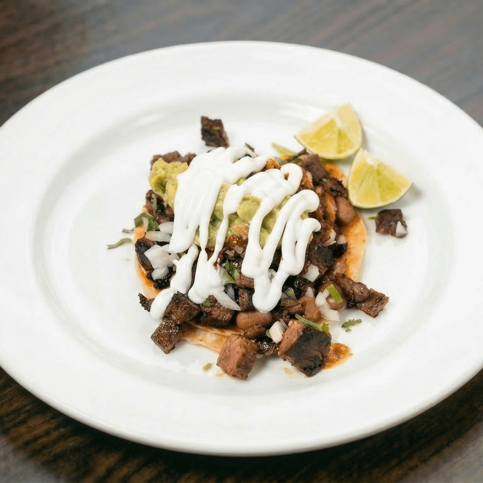 Choice of meat, cheese, whole pinto beans, cilantro, onions, salsa, guacamole, and sour cream.