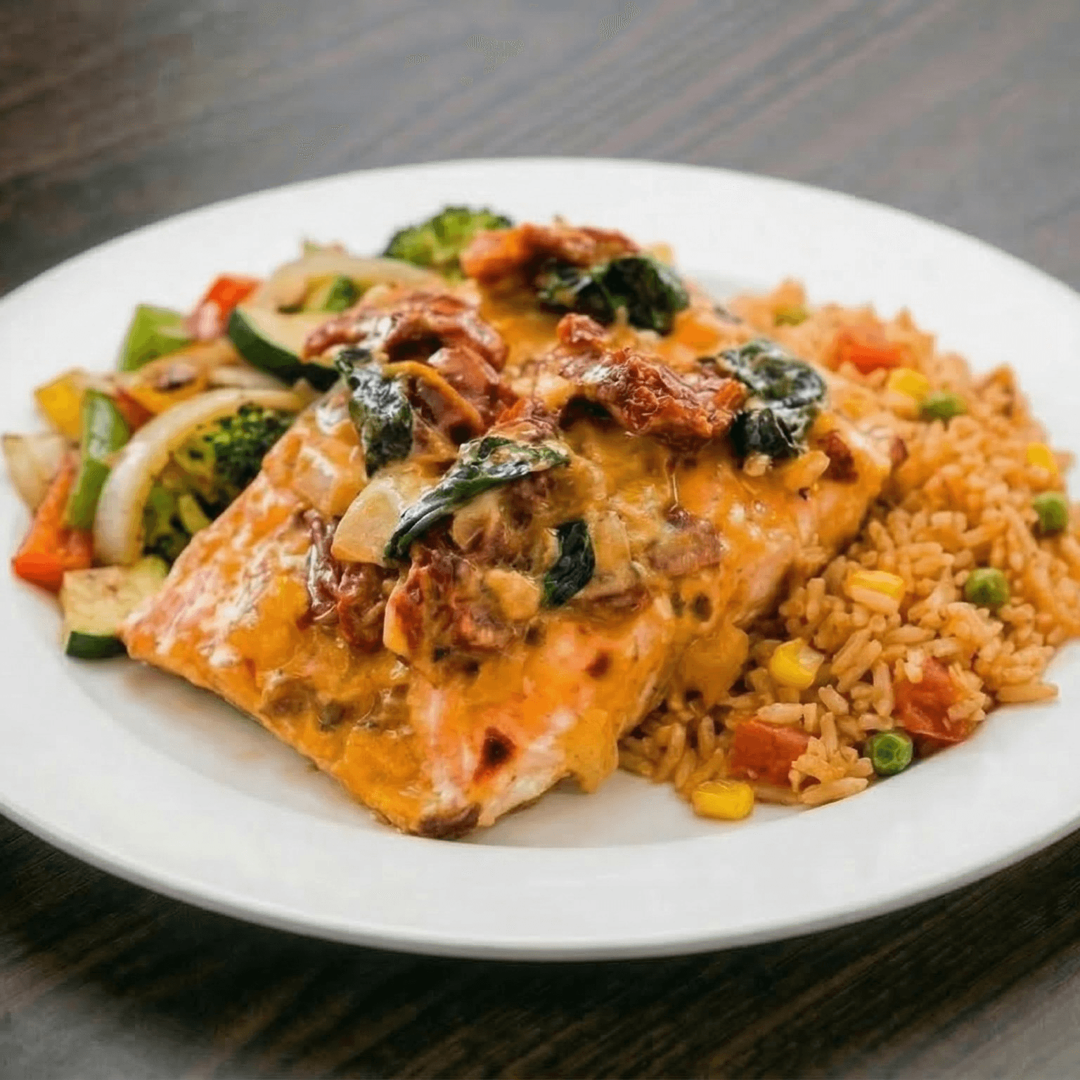 With sautéed vegetables, rice side salad, and tortillas.
