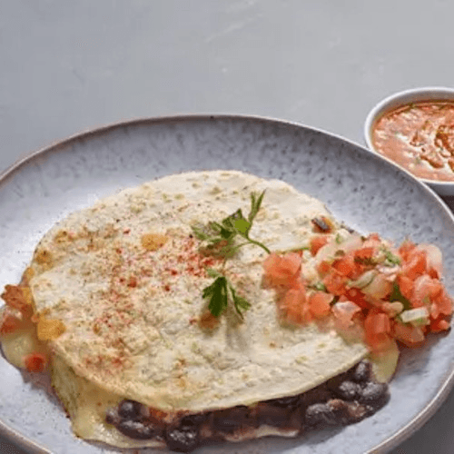 Cooked tortilla that is filled with cheese.