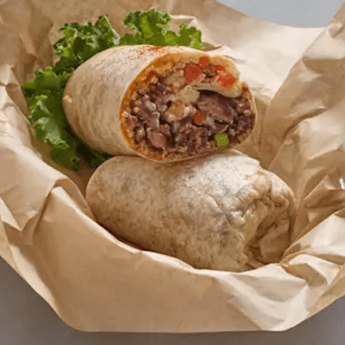 Flour tortilla filled with meat, beans, rice, guacamole, sour cream, lettuce, cheese and salsa