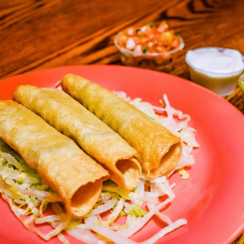 Salmon or tilapia, beans, rice and salsa, guacamole, sour cream, lettuce, cheese in a fried flour tortilla shell.