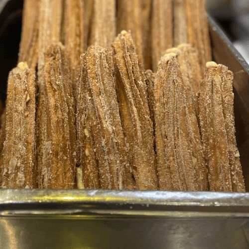 Fried pastry dusted with cinnamon sugar and filled with a sweet cream.