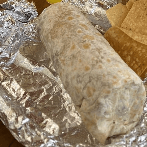 Flour tortilla filled with meat, beans, rice, guacamole, sour cream, lettuce, cheese and salsa