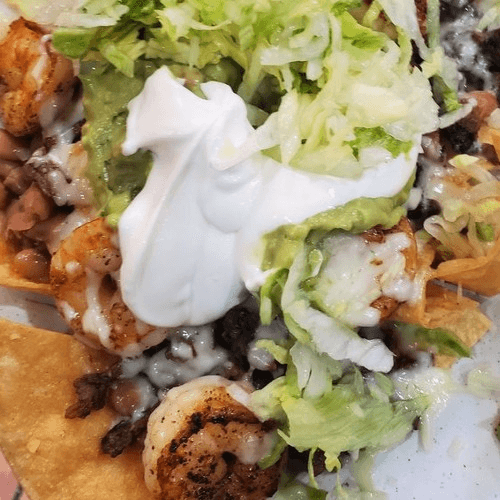 Prawns, Chips, Cheese, Beans, Guacamole, Sour cream, Lettuce, Cheese, Salsa.