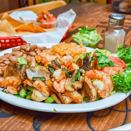 Prawns, beans, rice and salsa, guacamole, sour cream, lettuce, cheese in a fried flour tortilla shell.