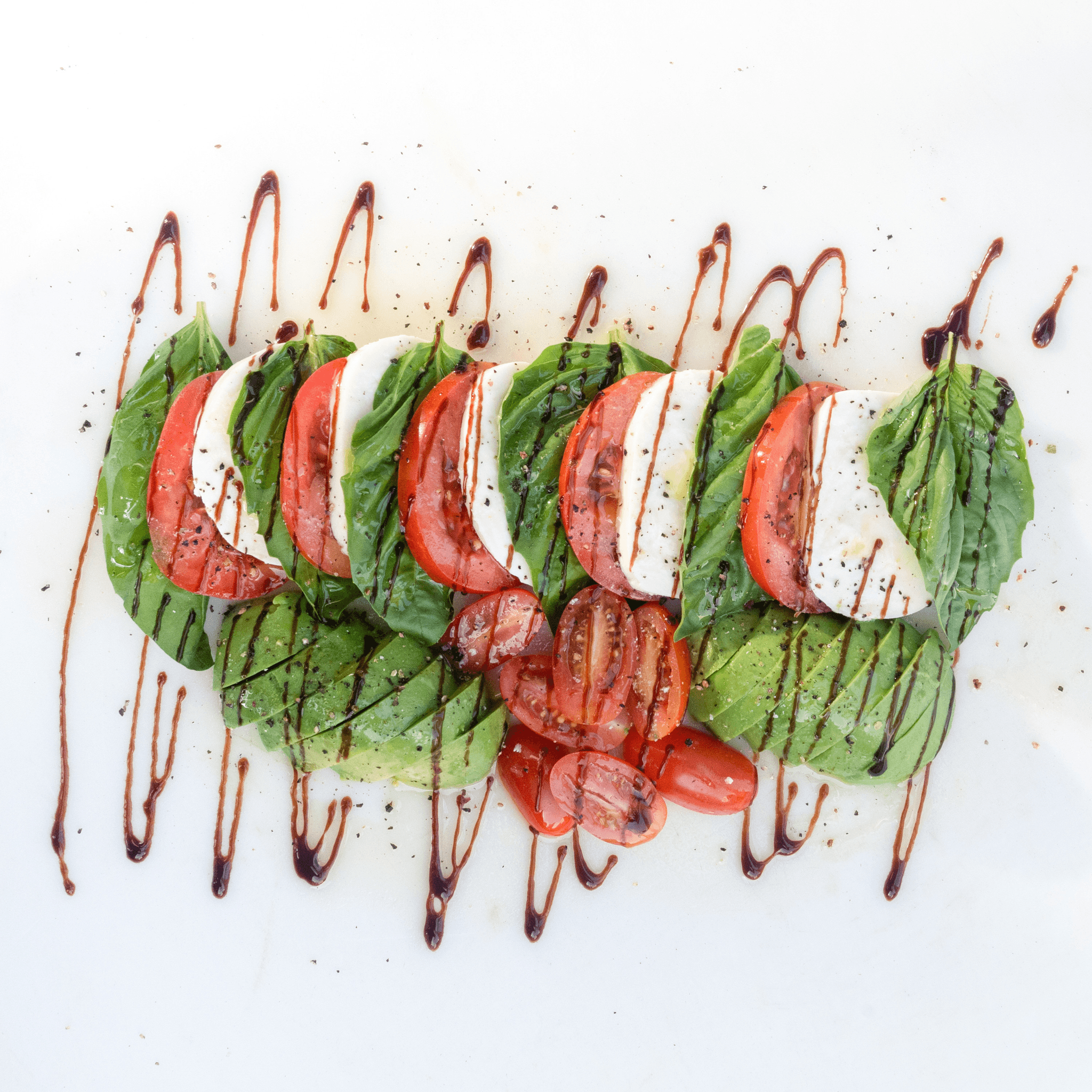 Avocado, fresh mozzarella, cherry tomatoes, basil, olive oil, balsamic.