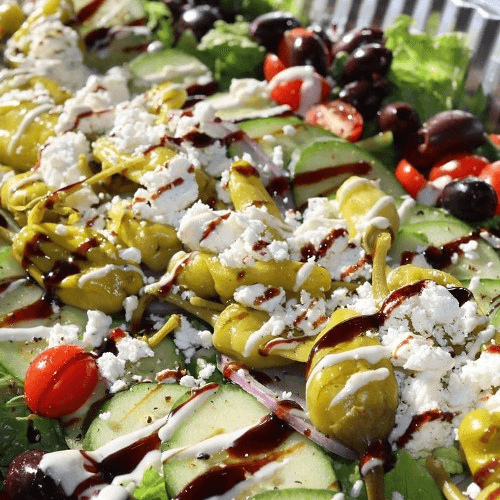 Romain, kalamata, cucumber, tomatoes, pepperoncini, red onions, feta, balsamic.