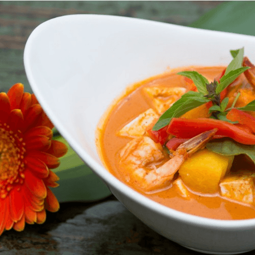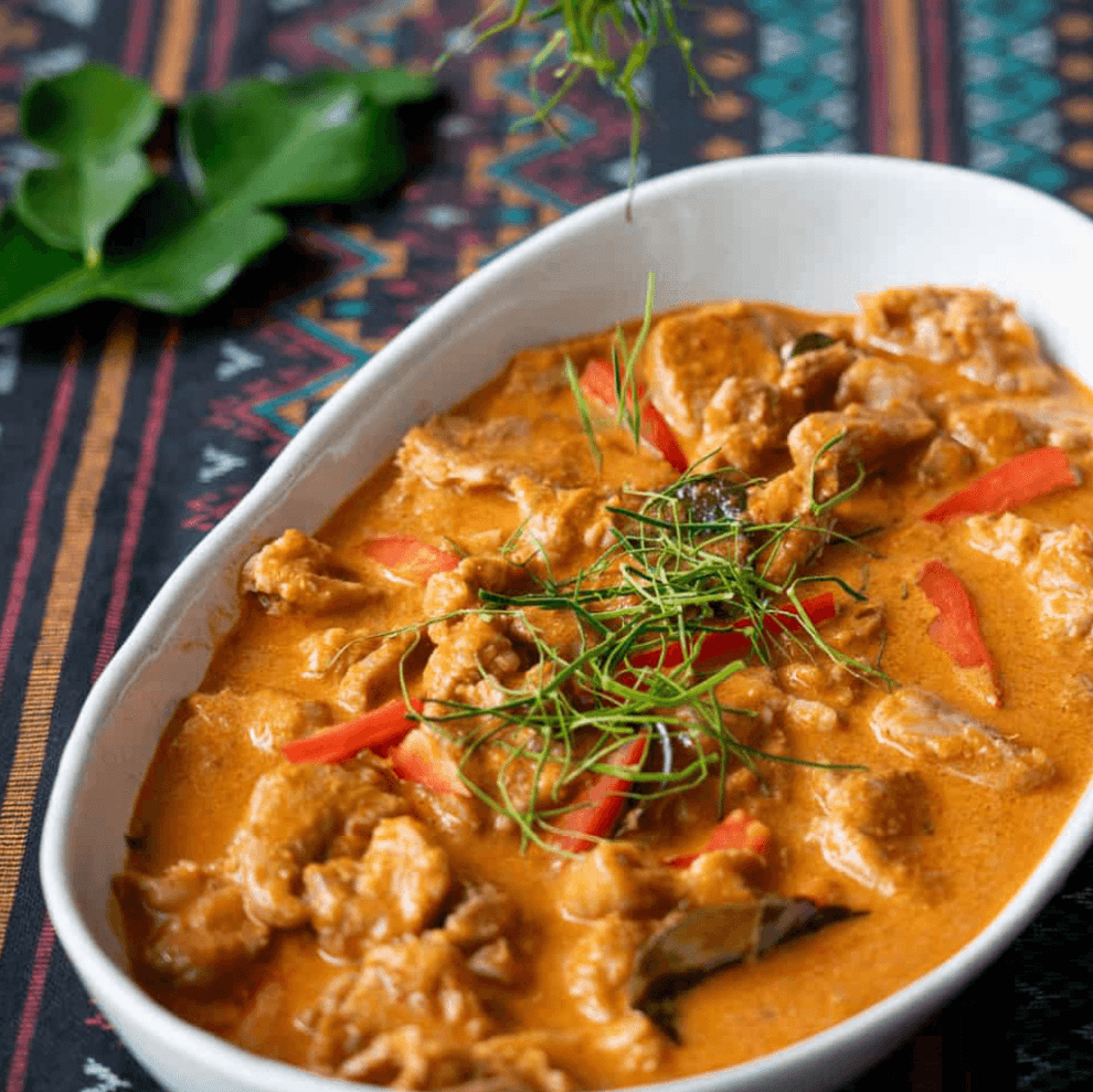 Meat or tofu, and onions in a rich, creamy sauce of red curry paste and peanuts