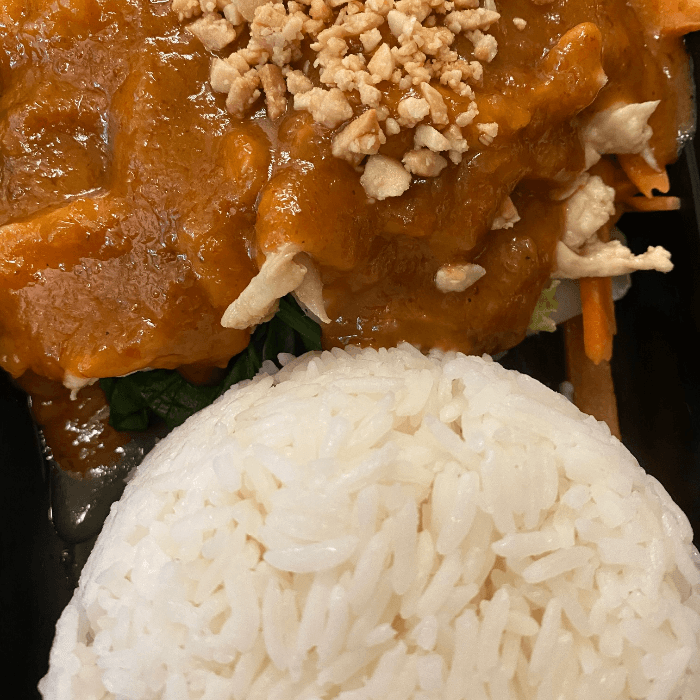 Pra Ram. Choice of meat or tofu, steamed mixed vegetables, topped with peanut sauce. Vegan option is available upon request