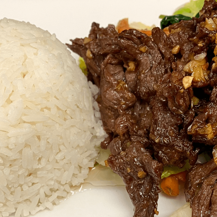 Sliced beef, pork, chicken, or tofu with Chinese broccoli sautéed in a rich garlic sauce. Vegan option is available upon request