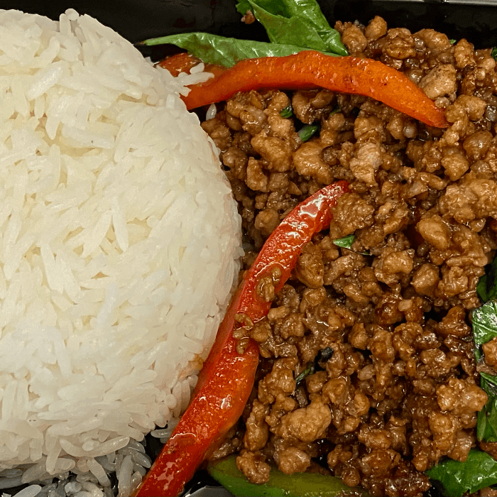 Ga Prow. Minced meat or cubed tofu with chili, basil, garlic and bell pepper. Vegan option is available upon request