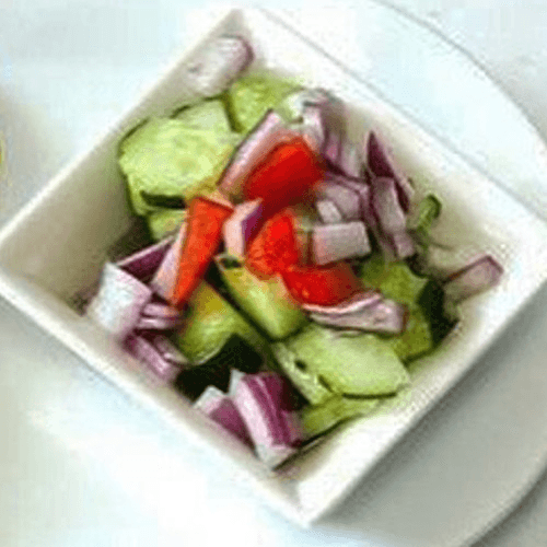 Minced chicken, potatoes, and carrots wrapped in a crispy pouch; served with cucumber salad.