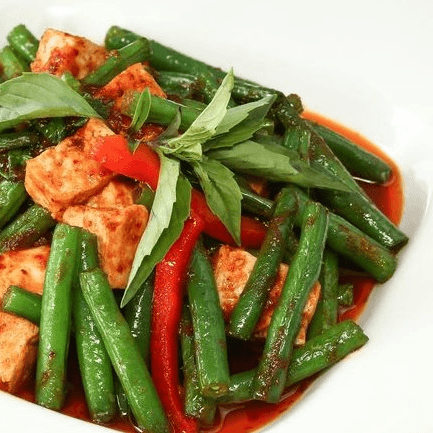 Prig King. Choice of meat or tofu, green beans, chili paste, bell pepper, and basil
