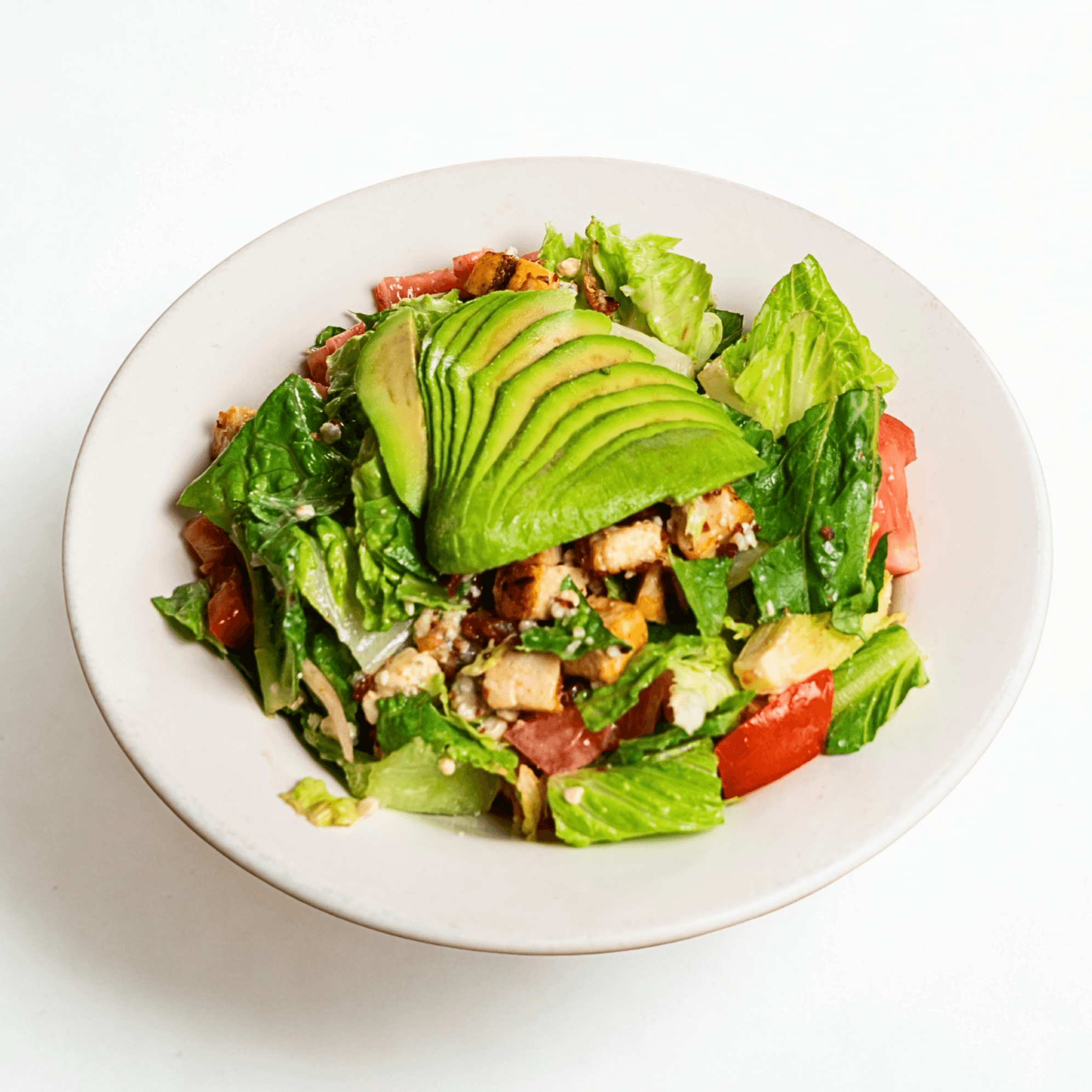 Crisp romaine topped with grilled chicken, bacon, avocado, tomatoes, gorgonzola, and a tangy blue cheese vinaigrette